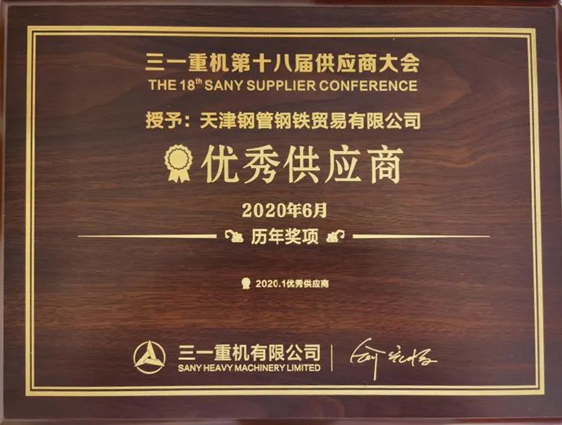 連續三年榮獲三一重機有限公司“優秀供應商”【天津大無縫鋼管廠】